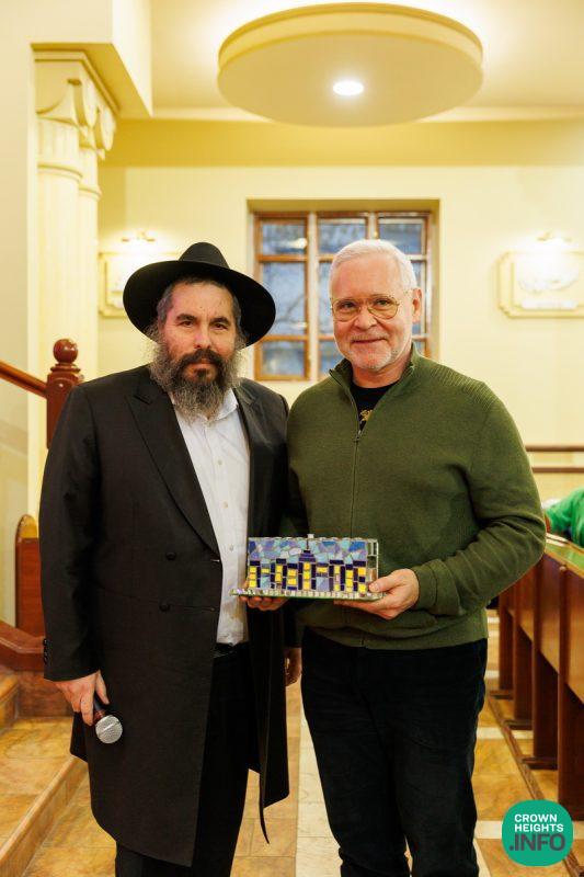 Rabbi Moshe Moskovitz, the shliach and Chief Rabbi of Kharkiv, shared a powerful message: “Not only do we add a light every night of Chanukah, increasing the light with each passing day, but this Chanukah has to be brighter and more meaningful than the last. We must shine even more than before.” He expressed his gratitude to the mayor and the city for allowing the menorahs to be displayed throughout Kharkiv and presented Mayor Igor Terekhov with a handmade menorah featuring an image of “Derzhprom,” the main government building, which had recently been struck by missiles. The menorah symbolized the triumph of light over darkness.