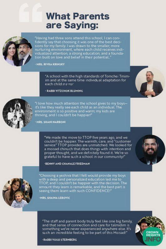 It’s not just Crown Heights parents taking notice. Shluchim from neighboring communities are finding a home for their children’s education in TTOP, where their sons will be nurtured, challenged, and prepared to spread Torah and Chassidus in their Shlichus.
