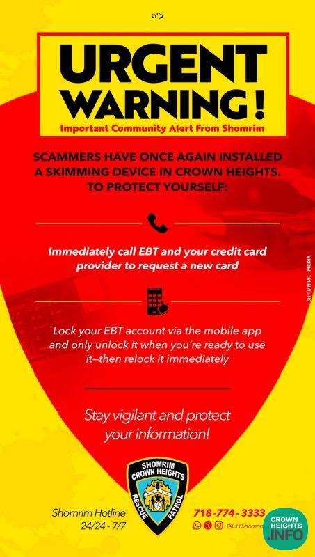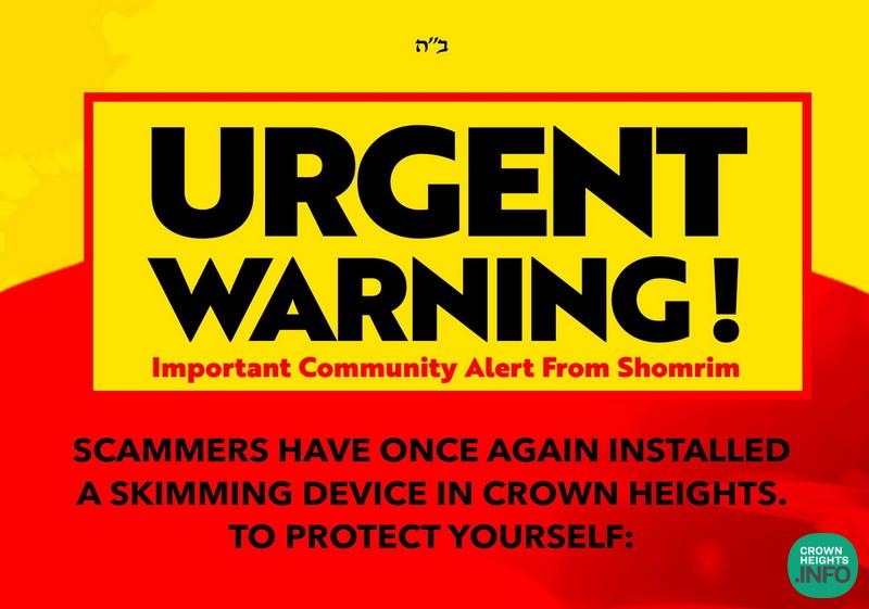 Crown Heights Shomrim released an urgent warning to the Crown Heights Jewish community Monday after a skimmer was found installed in a local store. Many people’s card information may have been compromised and Shomrim is advising the community to take action.