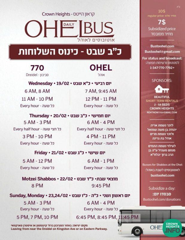 In honor of Chof Beis Shvat and the Kinus Hashluchos, the Ohel Bus Service will be providing extra subsidized transportation round trip from Crown Heights to the Ohel from Wednesday, the 21st of Shvat through Monday, the 26th of Shvat.