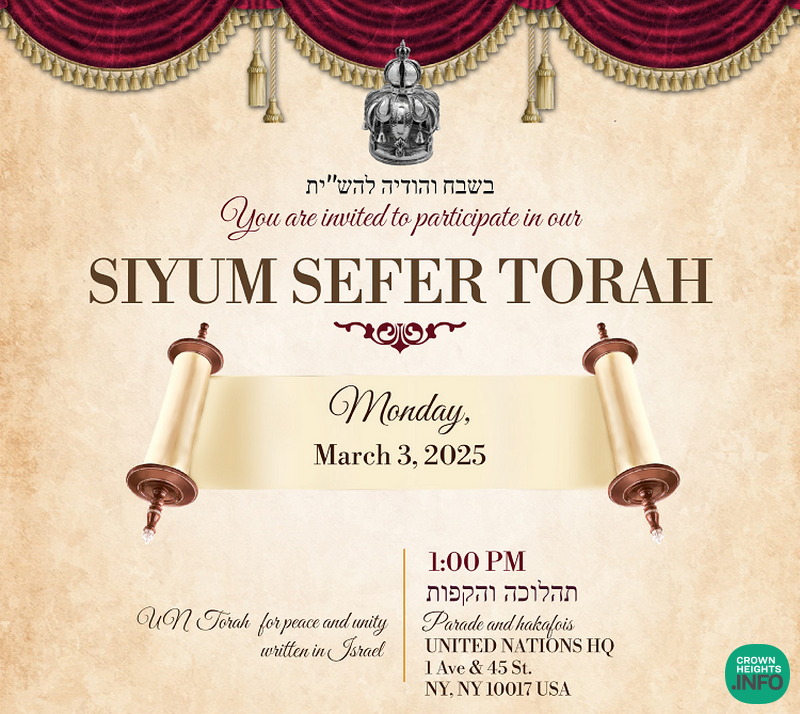 “The United Nations acknowledges human rights as well as humanity’s right to freedom, including that of religion. The Torah ceremony is open to all, including people to the United Nations of all races, religions and ethnicities. As the UN Torah scroll written in Israel is completed, on March 3, 2025 at 1pm we will have a joyful ceremony to welcome the new sacred addition in the UN HQ. It would be our honor for you to attend the Torah for Peace and Unity.”