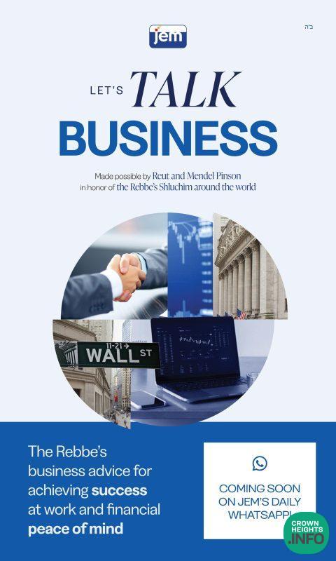 Let’s Talk Business: A new WhatsApp series from JEM, launching on Sunday (Feb 23rd), will bring you key points and recurring themes of the Rebbe’s approach to financial success. Click here to sign up.