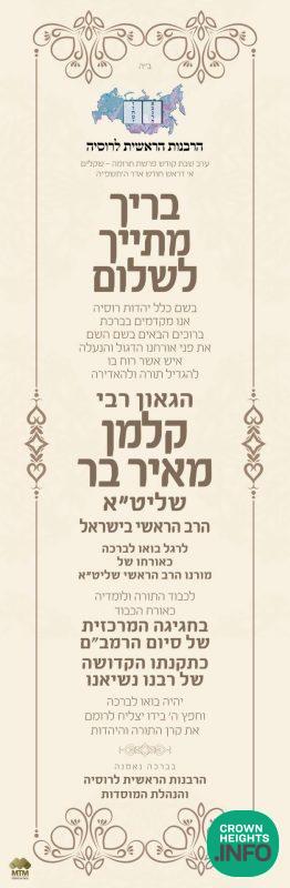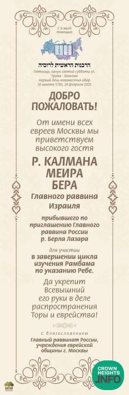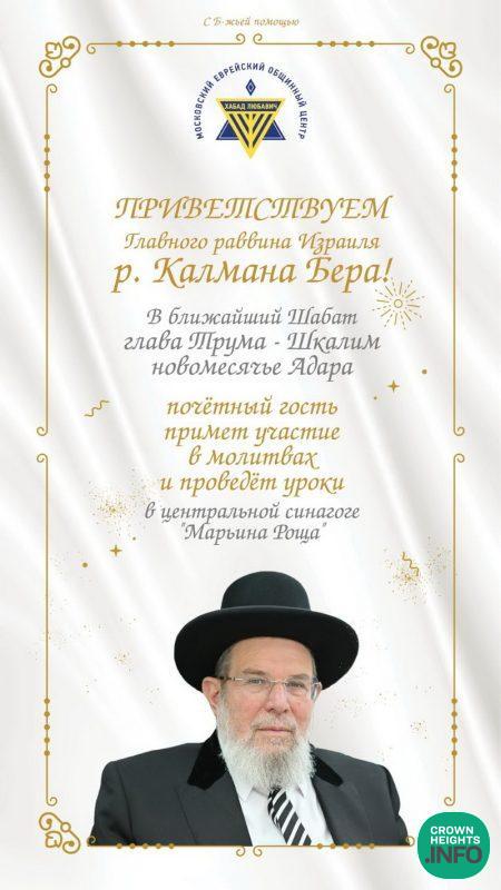 The news of the arrival of the distinguished guest, HaGaon Rabbi Kalman Meir Bar Shlita, Chief Rabbi of Israel and President of the Council of the Chief Rabbinate of Israel, was received with great enthusiasm in Russia, after he accepted the invitation of the Chief Rabbi of Russia, HaGaon Rabbi Berel Lazar Shlita, to pay an official visit.
