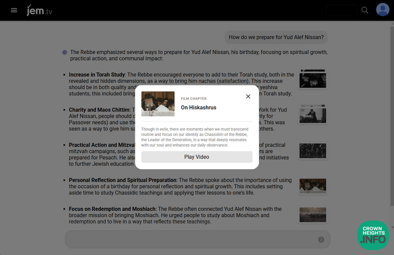 For decades, Jewish Educational Media (JEM) has meticulously curated, translated, and produced thousands of videos capturing the Rebbe’s teachings and personal interactions. Soon, JEM will be rolling out a groundbreaking AI-powered tool that will transform how users access and explore this vast archive.