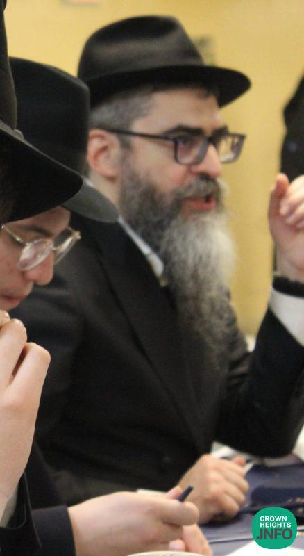 After Minchah, there was a special farbrengen in the Zal with Rabbi Sender Geisinsky (Maryland). The farbrengen was followed by Maariv, a video of the Rebbe and dancing for Chodesh Adar. A special Melave Malkah – “Siyum Harambam” – took place in the yeshivah’s Boymel Rabbinical College. The Siyum was made by Rabbi Yitzchak Meir Lifshitz – Marah D’Asrah of Cincinnati – and the new cycle of Rambam was started by Rabbi Eliyahu Simpson.