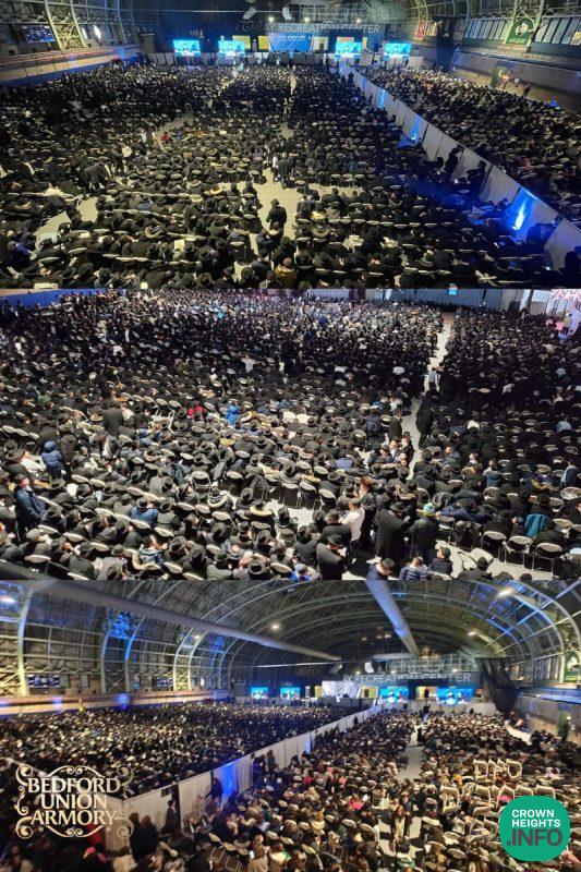 Following the Rebbe’s directive regarding the Siyum date falling on Erev Shabbos Kodesh, when it would be difficult to hold a large gathering, the celebration was moved to the following Sunday. As the appointed hour approached, the streets of Crown Heights leading to the Armory were filled with people — young and old, Talmidei HaTemimim, and entire families — making their way to the grand celebration. A special transportation system was organized by the Siyum Committee to accommodate the large crowds.