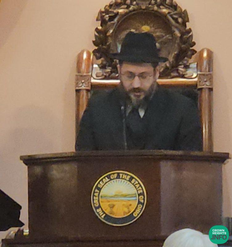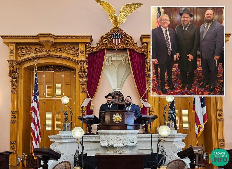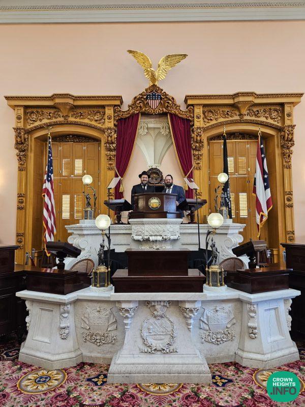 Rabbi Avtzon used this special opportunity – in under 3 minutes – to speak about Purim, Sheva Mitzvos Bnei Noach, Moment of silence and preparing for Moshiach. After the address, many of the elected officials came over to discuss making a moment of silence mandatory in all schools in the state of Ohio. A bill will be introduced this week to start the process. Rabbi Aryeh Kaltman, Shliach to Colombus Ohio, has put much time and energy into this effort.