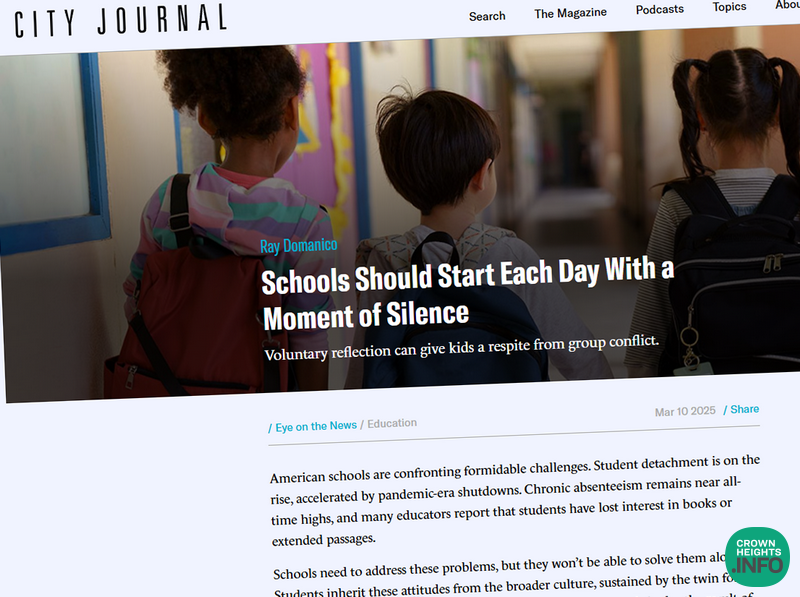 As we approach the Rebbe’s 123rd birthday—recognized as Education and Sharing Day in honor of the Rebbe’s contributions to education—a powerful City Journal article highlights the growing momentum behind the Moment of Silence initiative, inspired by the Rebbe’s vision. A Meaningful Moment is leading the way, the impact is real—and growing.