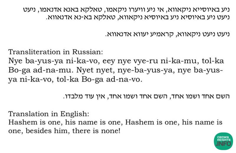 While most people understandably begin the niggun at the words “Nyet, Nyet Nikavo”, as it was many times sung by the Rebbe, the niggun actually has a first stanza that few who do not speak Russian tend to sing.
