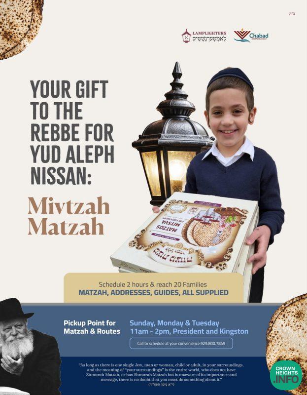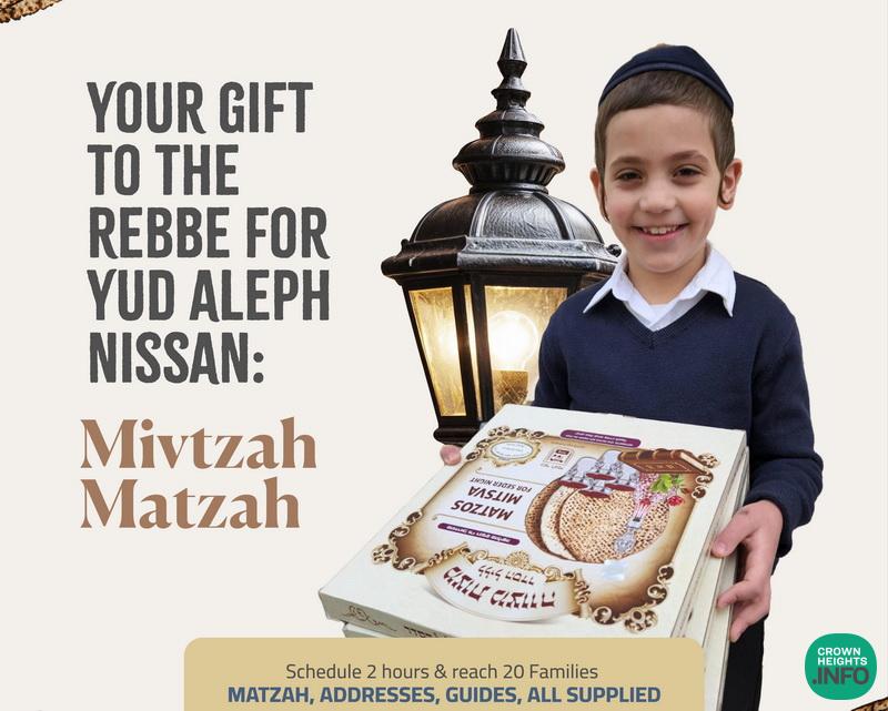 Everyone is invited to contribute to this meaningful project and make this Yud Aleph Nissan even more special by helping to distribute Matzah to Jewish families in Brooklyn.