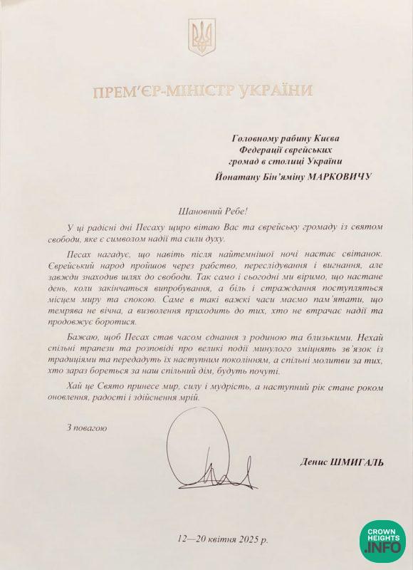 In honor of Passover, Ukrainian Prime Minister Denys Shmyhal sent an official letter of greeting to Rabbi Yonatan Markovitch, Chief Rabbi and emissary in Kyiv, extending warm wishes to the Jewish community of Ukraine for the holiday of freedom.