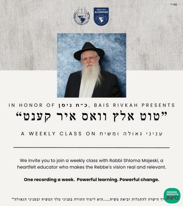 Bais Rivkah Alumnae Launches Weekly Inyonei Geulah uMoshiach Class With Rabbi Shloma Majeski