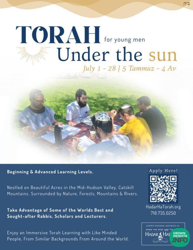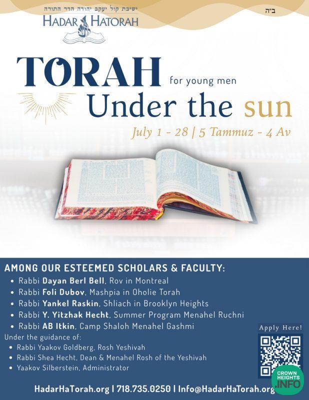 Hadar Hatorah is excited to announce its new and improved summer Yeshivah learning program, “TORAH UNDER THE SUN”, designed for both beginners and more advanced students. This unique program offers an enriching opportunity for individuals at any stage of their Torah journey to dive into intensive learning, personal growth, and spiritual development.