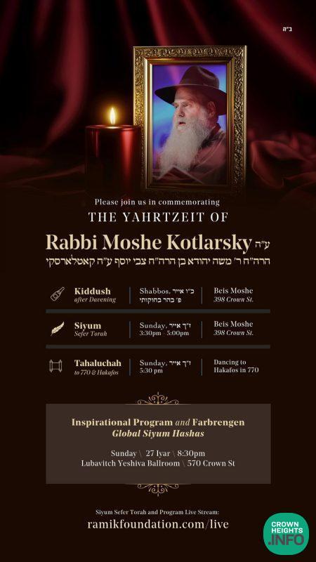 Tomorrow, the global Jewish community will be marking Rabbi Moshe Kotlarsky’s first Yartzeit with a Torah completion ceremony, Siyum Hashas, and an uplifting Farbrengen drawing inspiration from the Rebbe’s devoted chossid and global ambassador.