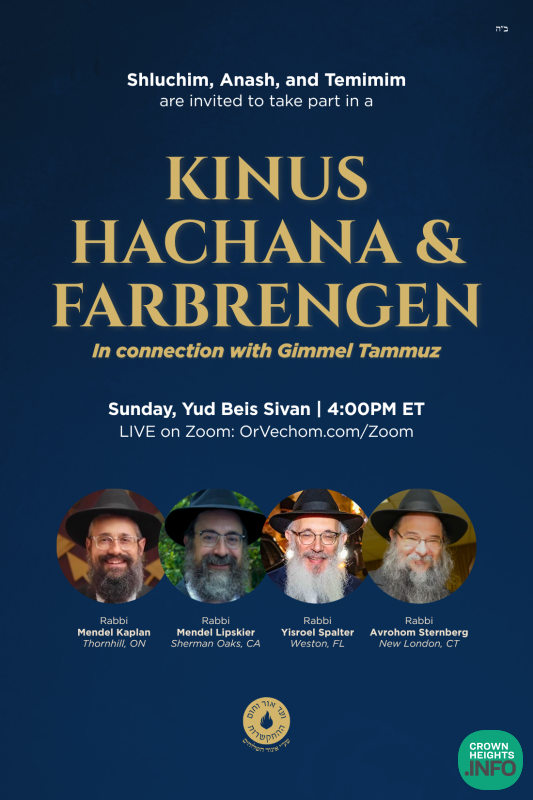 As we approach the holy day of Gimmel Tammuz, and Chassidim around the world look for meaningful ways to prepare and strengthen their hiskashrus to the Rebbe with their families and communities, Vaad Or Vechom Hahiskashrus invites the public to a virtual Kinus Hachana and Farbrengen.