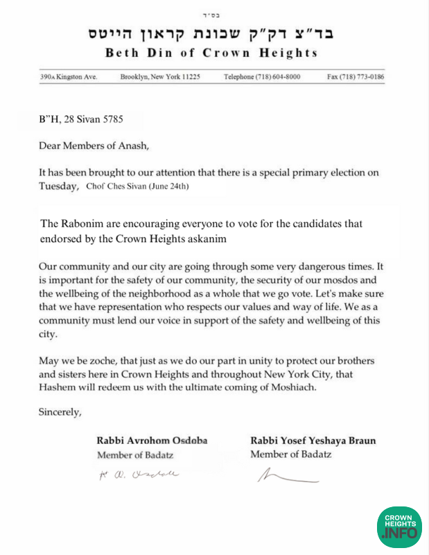 The Rabbonim of the Crown Heights Bais Din have released a letter to the community encouraging every eligible person to go out and vote in the ongoing primary.