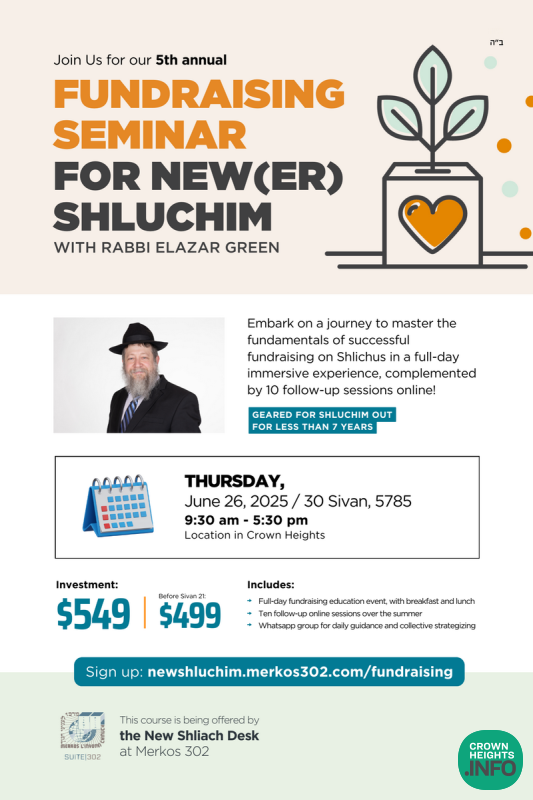 New Shluchim eager to begin their Shlichus will gather in Crown Heights this Thursday, June 26, 2025 (30 Sivan, 5785) for the fifth annual fundraising seminar, hosted by Merkos 302’s New Shliach Desk. This full-day immersive training is designed to provide the tools, confidence, and direction needed to approach fundraising with purpose as they start building their communities.