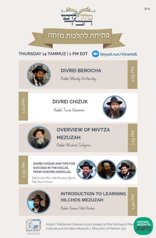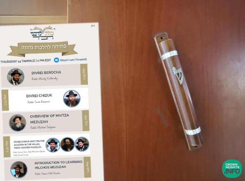 As Kollel L’Rabbonei Chabad starts the sugya of Hilchos Mezuzah for their summer zman, they invite the community of shluchim and anash to their introductory shiur. It will include a presentation by Rabbi Michoel Seligson on mivtza mezuzah.