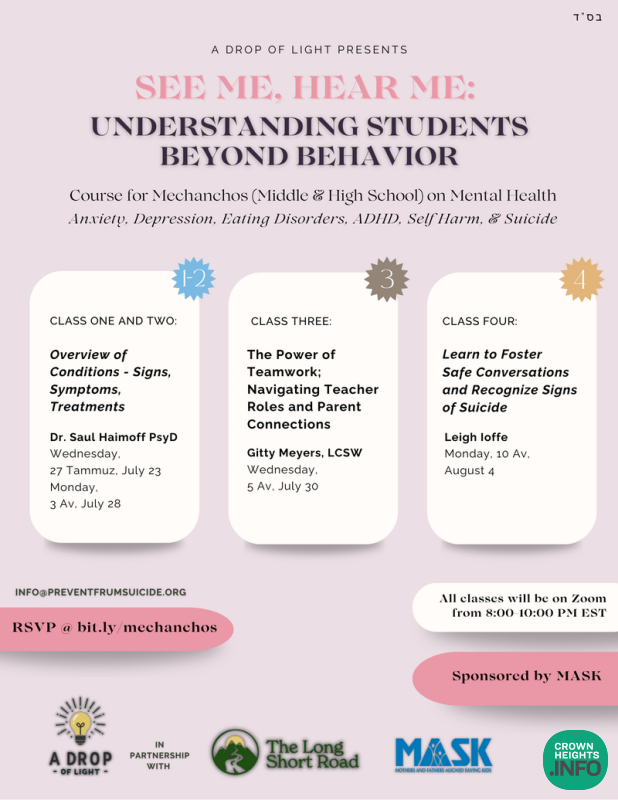 To help you navigate these challenges, A Drop of Light, in partnership with The Long Short Road and MASK, has created a course for middle and high school mechanchos (female staff). This course will b’ezras Hashem give teachers and educators the knowledge and tools to effectively help and support their students.