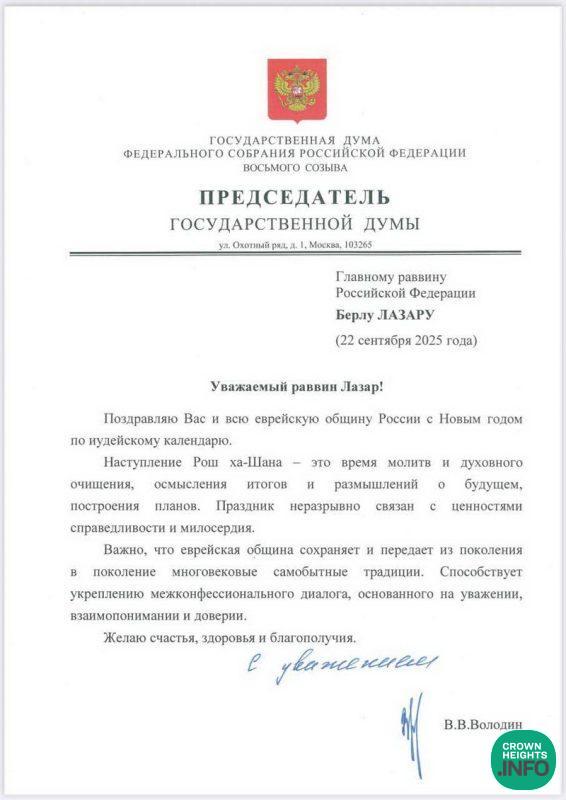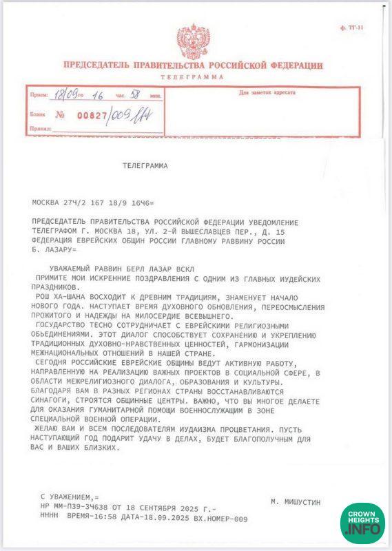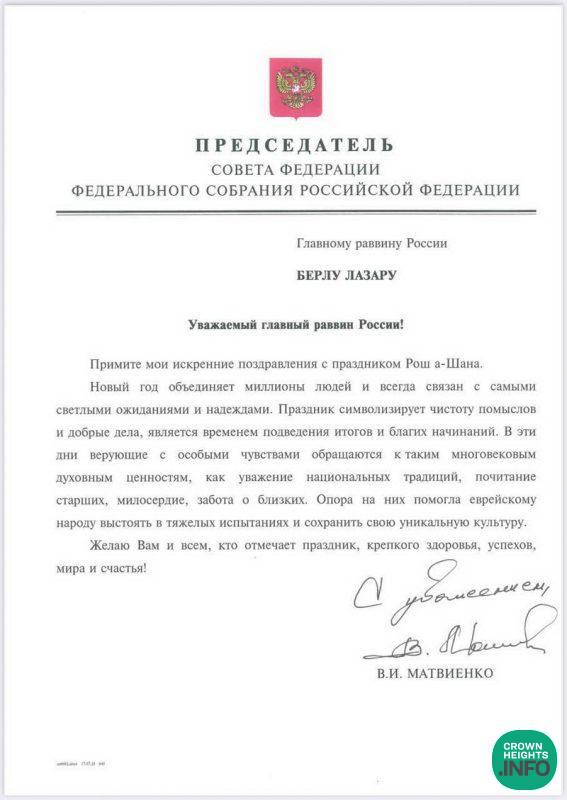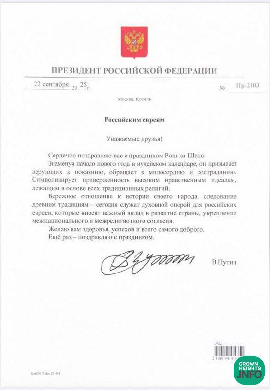 In addition to congratulatory letters sent by the Russian Prime Minister, the Speaker of Parliament, the Speaker of the State Duma, and other heads of state, on the eve of the holiday, the Chief Rabbi’s office also received a congratulatory letter from the Russian President, in which he writes: “To the Jews of Russia, distinguished friends! I hereby congratulate you on the holiday of Rosh Hashanah. This holiday, which marks the beginning of the new year on the Jewish calendar, calls upon the faithful to repentance, kindness, and mercy. It symbolizes adherence to high moral visions, which are at the foundation of all traditional religions. Respectful treatment of the people’s history and adherence to the traditions of the ancestors now serve as a spiritual cornerstone for Russian Jews, who make an important contribution to the development of the country, to strengthening ties of friendship and mutual understanding between peoples of different nations and religions. I wish you good health, complete success, and all the best, and once again – many congratulations on the holiday! Vladimir Putin.”