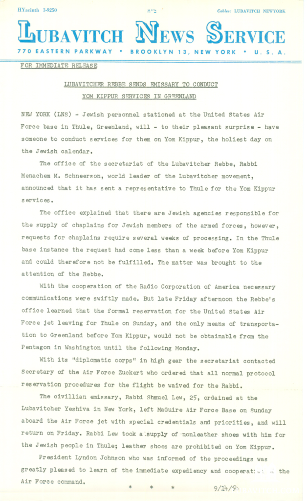 From the archives: A 1964 press release by Lubavitch News Service reporting on a special Yom Kippur mission to a remote US Air Force Base in Greenland, at the instructions of the Lubavitcher Rebbe.