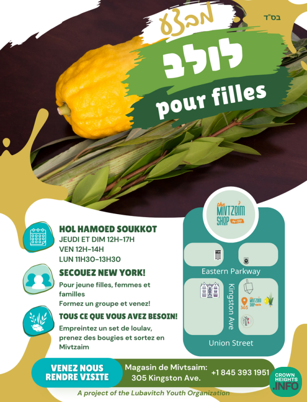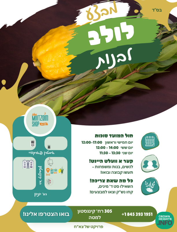 The Mivtzoim Shop was established by the Lubavitch Youth Organization a few years ago to help meet the Mivtzoim needs of women and girls. The Mivtzoim Shop at 305 Kingston Avenue has made Mivtzoim quick, easy, and accessible for girls, with a one-stop-shop making available Neshek kits, Yom Tov guides, and more.