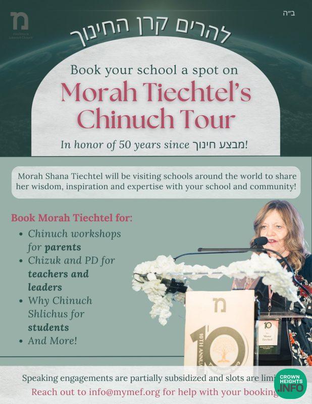 Schools can sign up for a spot on the tour for a transformative experience, where Morah Tiechtel’s unmatched passion and wisdom will inspire staff, students and parents on Chinuch goals, ideas and practices, illuminated by the Rebbe’s teachings. Morah Tiechtel will also speak and farbreng, offering tailored professional development to each school’s staff, workshops to students and addresses to parents to empower them in their roles as educators today.