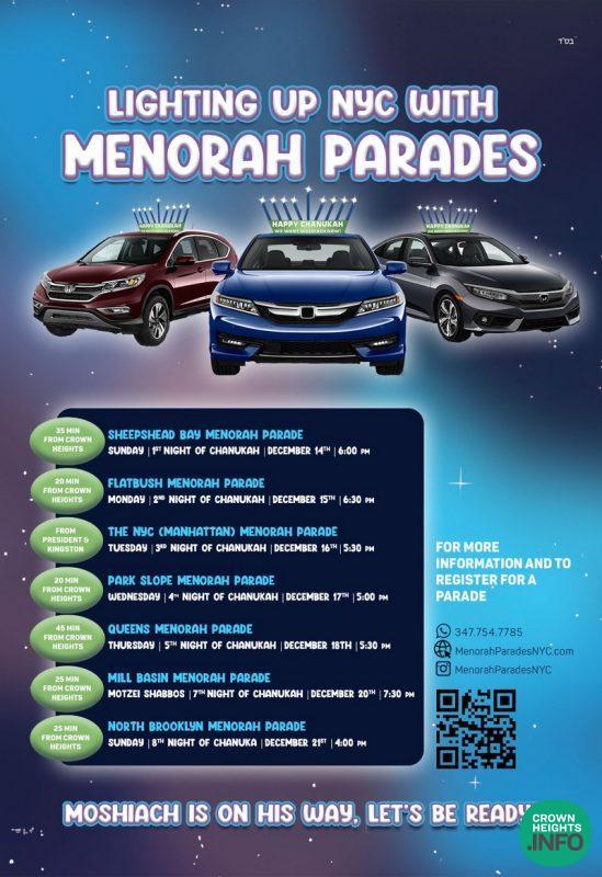 For questions, please WhatsApp 347-754-7785 or email MenorahParadesNYC@gmail.com