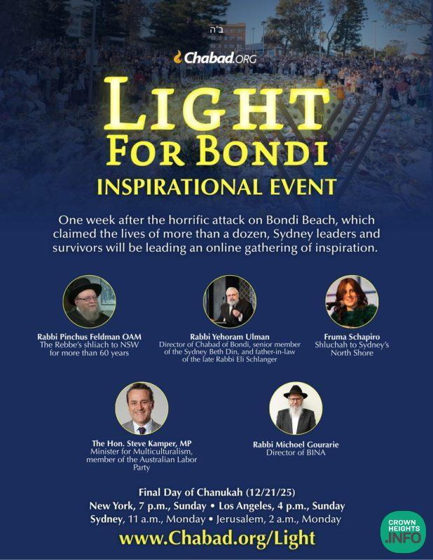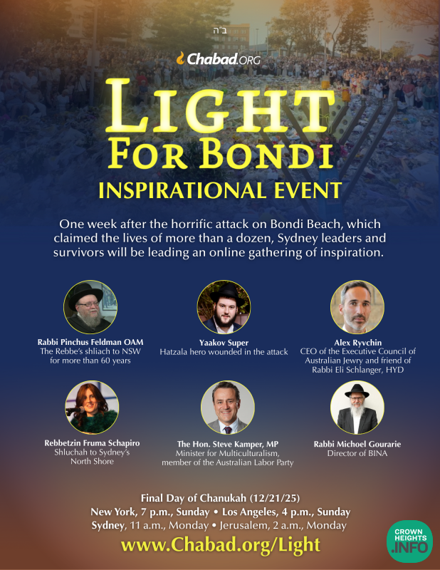 Broadcasting from Chabad.org/Light, it is expected to include messages from Rabbi Pinchus Feldman OAM, the Rebbe’s shliach to NSW for more than 60 years; the Hon. Steve Kamper, MP Minister for Multiculturalism, member of the Australian Labor Party; Rabbi Michoel Gourarie, director of BINA, Fruma Schapiro, shluchah to Sydney’s North Shore and Rabbi Yehoram Ulman, director of Chabad of Bondi, senior member of the Sydney Beth Din, and father-in-law of the late Rabbi Eli Schlanger.