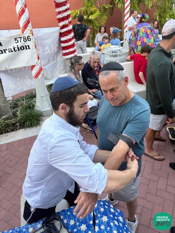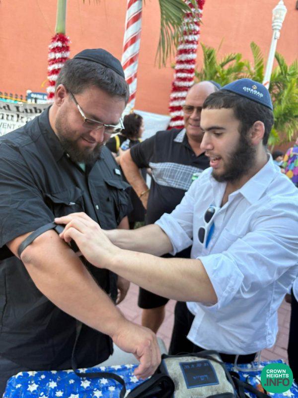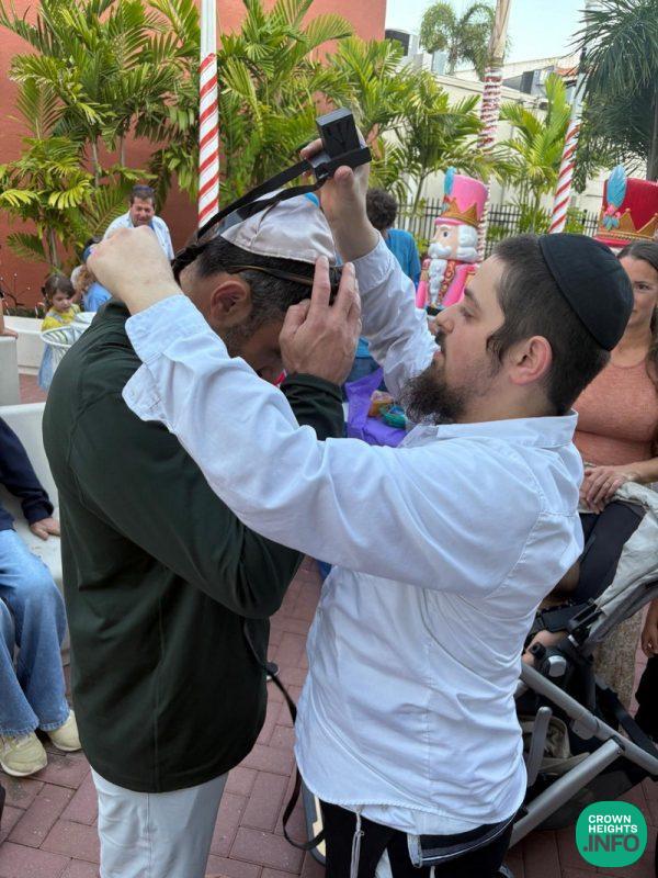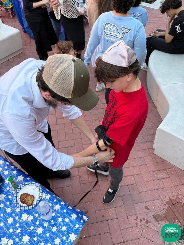 Adding to the inspiration of the evening, dedicated Chabad bochrim moved throughout the crowd, helping many Jewish attendees put on tefillin some for the very first time. Singing and dancing soon filled the park, transforming the celebration into an expression of pure joy, connection, and Jewish pride.
