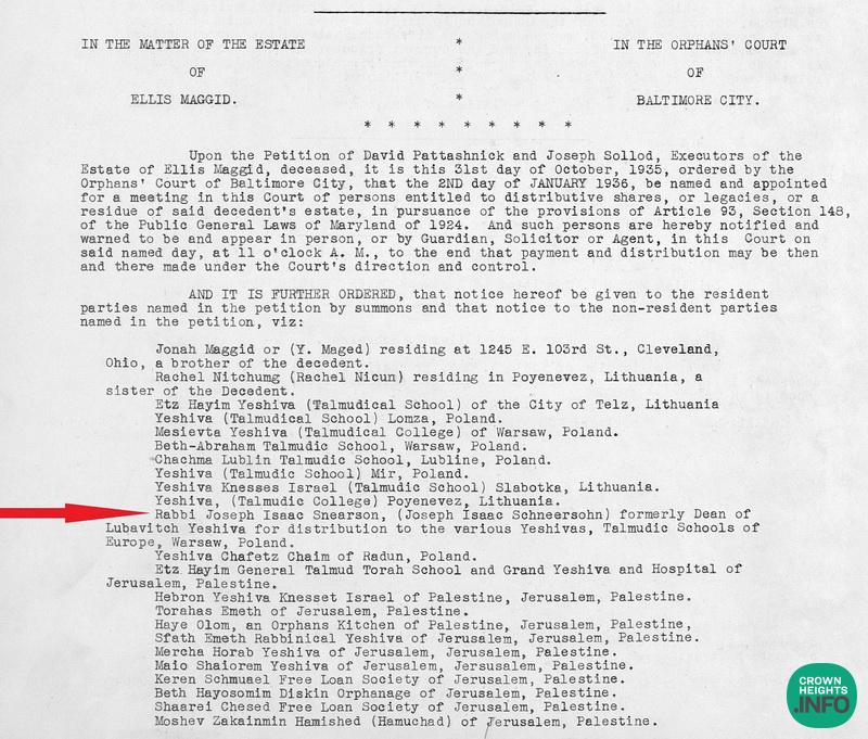 According to Orphans Court Proceedings T604/C2558-154 (Baltimore Orphan Records, October 1935–January 1936), the estate of Ellis Maggid was distributed in part to numerous Torah institutions and charitable causes across Europe and Eretz Yisroel. Among the listed beneficiaries is Rabbi Yosef Yitzchak Schneerson, the Sixth Lubavitcher Rebbe, identified in the court document as “Rabbi Joseph Isaac Schneerson … formerly Dean of Lubavitch Yeshiva,” with the funds designated for distribution to various yeshivos and Talmudic schools of Europe, Warsaw, Poland.