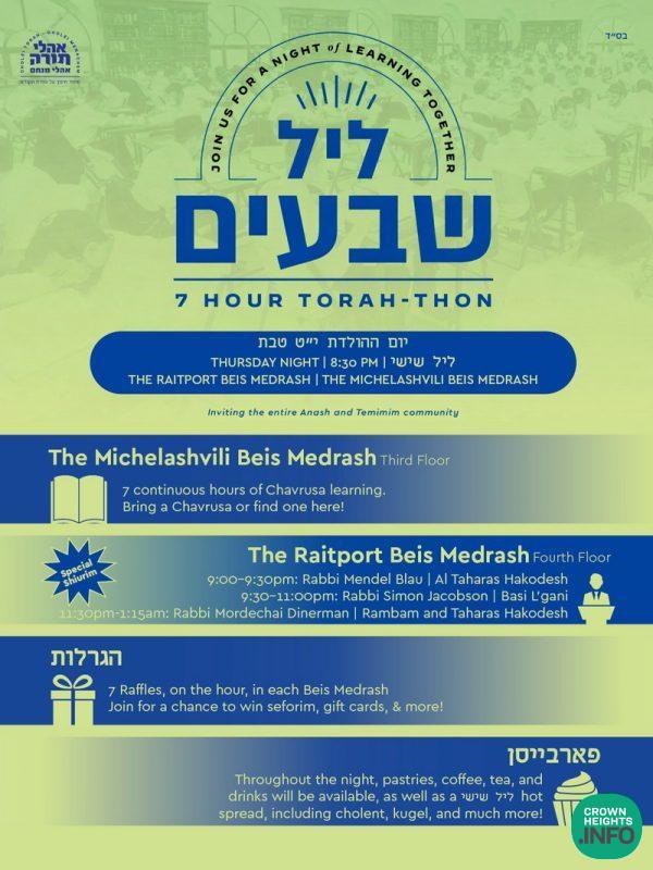 This evening, the celebration extends beyond the preschool and cheder divisions. Beis Medrash Oholei Torah is hosting a special Leil Shishi 7 hour Torah-thon, open to the community. Anash and Temimim are invited to join together in chavrusa learning, special shiurim by Rabbi Simon Jacobson and Rabbi Mordechai Dinerman, 7 raffles on the hour, and leil shishi hot spread.