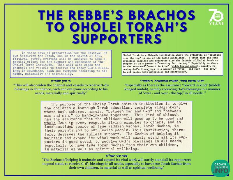 In a letter from the Rebbe to Oholei Torah’s supporters on 2 Sivan 5729, the Rebbe writes: “In the days of preparation for the Festival of our Receiving the Torah…. Surely everyone will be inspired to make a special effort for the support and expansion of the Oholei Torah Institute. This will also widen the channel and vessels to receive G-d’s blessing in abundance, each and everyone according to his needs, materially and spiritually.”