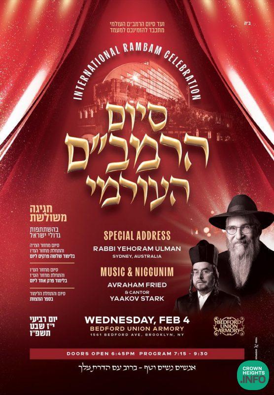 The historic triple Siyum HaRambam, marking the triple completion of the Rambam study cycles, will take place on Wednesday, 17 Shevat 5786 – February 4, 2026, at the Bedford Union Armory in Crown Heights. Conveniently located within walking distance for the Crown Heights community, the event is expected to welcome participants from the local community as well as Jews arriving from near and far.