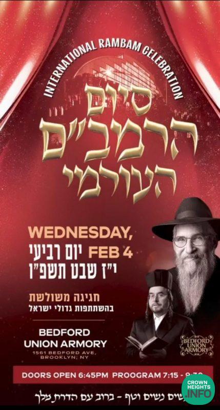 The historic triple Siyum HaRambam, marking the triple completion of the Rambam study cycles, will take place on Wednesday, 17 Shevat 5786 – February 4, 2026, at the Bedford Union Armory in Crown Heights. Conveniently located within walking distance for the Crown Heights community, the event is expected to welcome participants from the local community as well as Jews arriving from near and far.