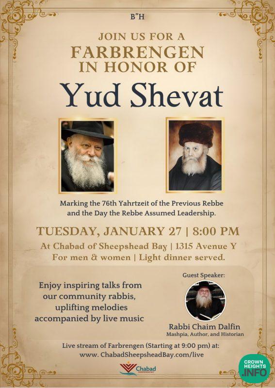 Chabad of Sheepshead Bay will be hosting a Yud Shevat farbrengen tonight, January 27th, at 9:00 PM featuring Rabbi Chaim Dalfin. The Farbrengen will be streamed LIVE for Anash across the globe.