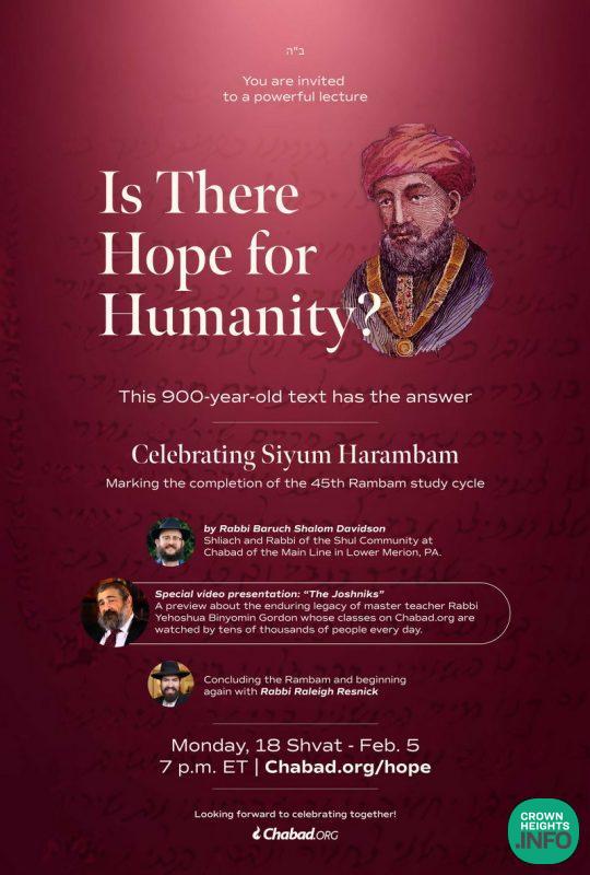 As the world faces complex challenges, Chabad.org invites the public to discover the Rambam’s 900-year-old prescription for optimism for humanity. This is the topic of a keynote lecture by Rabbi Boruch Shalom Davidson of Chabad of the Main Line, PA. It will take place at a virtual event streaming on Thursday, February 5 (18 Shevat) at 9:00 p.m. ET / 6:00 p.m. PT, marking the conclusion of the 45th annual cycle of the daily study of Mishneh Torah.