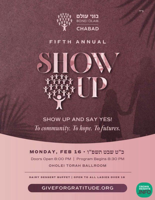 Bonei Olam Chabad invites the Crown Heights community and friends to the fifth annual Show Up event, an evening dedicated to presence, purpose, and hope.