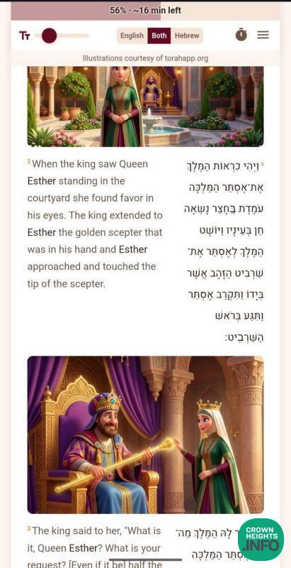 AI-generated illustrations from TorahApp.org bring the Purim story to life alongside the text. Reading time estimates help Shluchim plan their events. Translations in nine languages. A grogger button. Shake-to-grogger. Haman’s name highlighted in, as one shliach put it, “a less honorable way.”