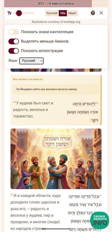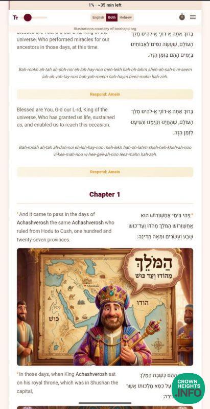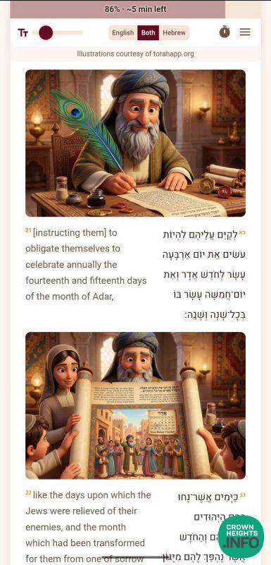 AI-generated illustrations from TorahApp.org bring the Purim story to life alongside the text. Reading time estimates help Shluchim plan their events. Translations in nine languages. A grogger button. Shake-to-grogger. Haman’s name highlighted in, as one shliach put it, “a less honorable way.”