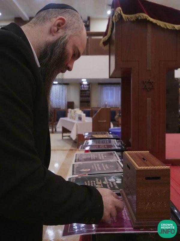 Alexander Gorodetsky, a dear 95-year-old Jew, arrived at the Shul and handed over to the Chief Rabbi of Russia, Rabbi Berel Lazar Shlita, an antique miniature Megillah written on klaf and placed inside a decorated pure silver case.