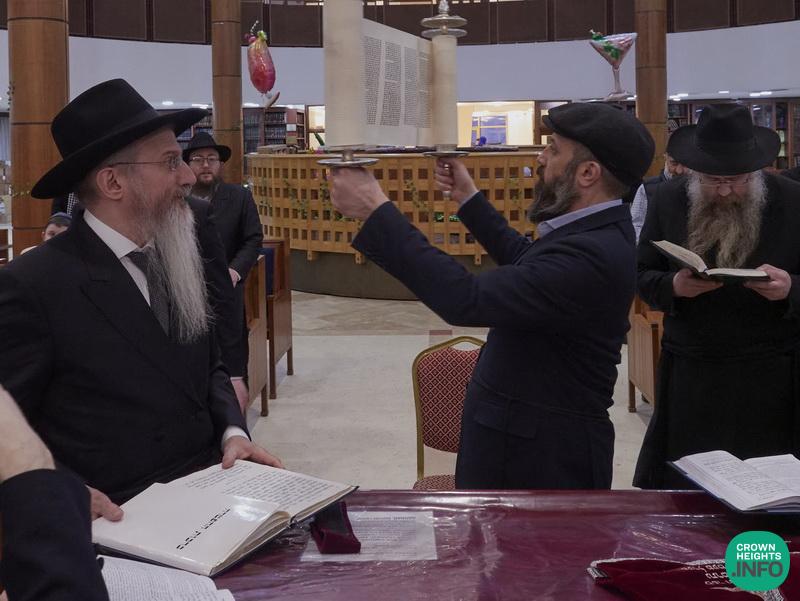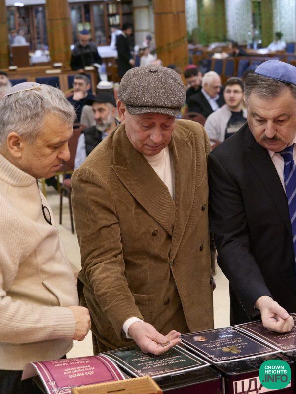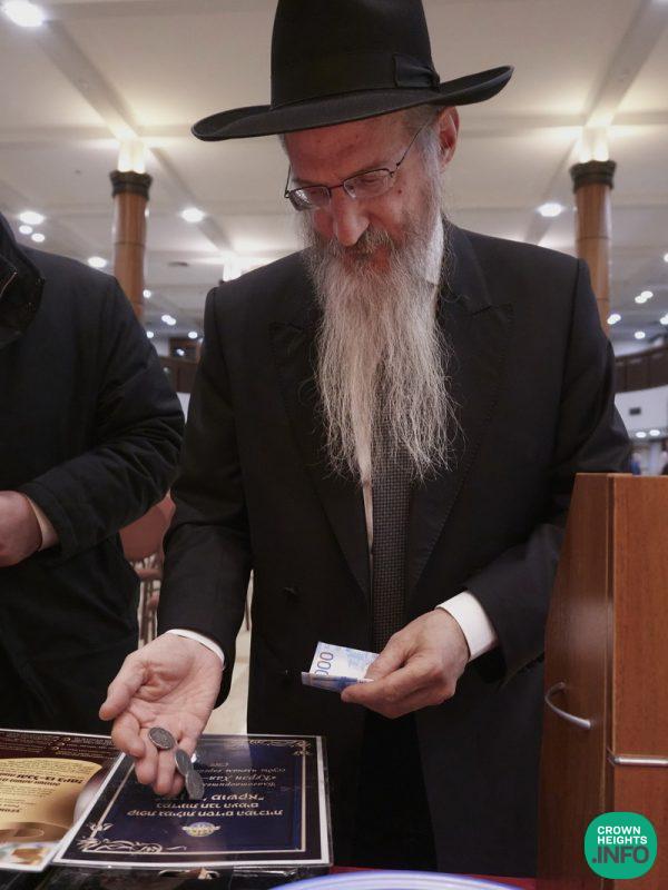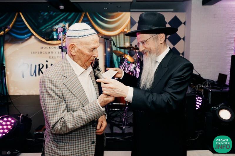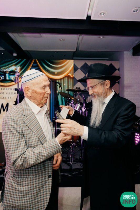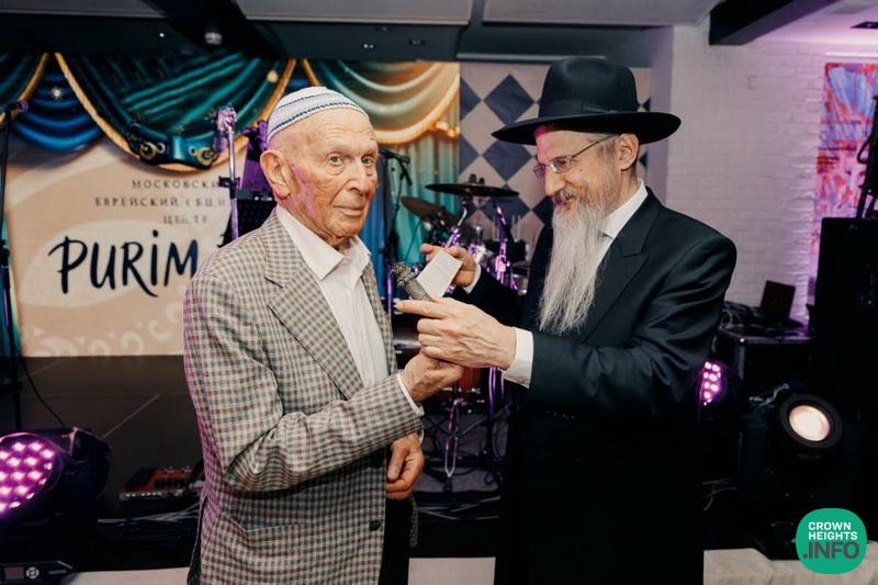 Alexander Gorodetsky, a dear 95-year-old Jew, arrived at the Shul and handed over to the Chief Rabbi of Russia, Rabbi Berel Lazar Shlita, an antique miniature Megillah written on klaf and placed inside a decorated pure silver case.
