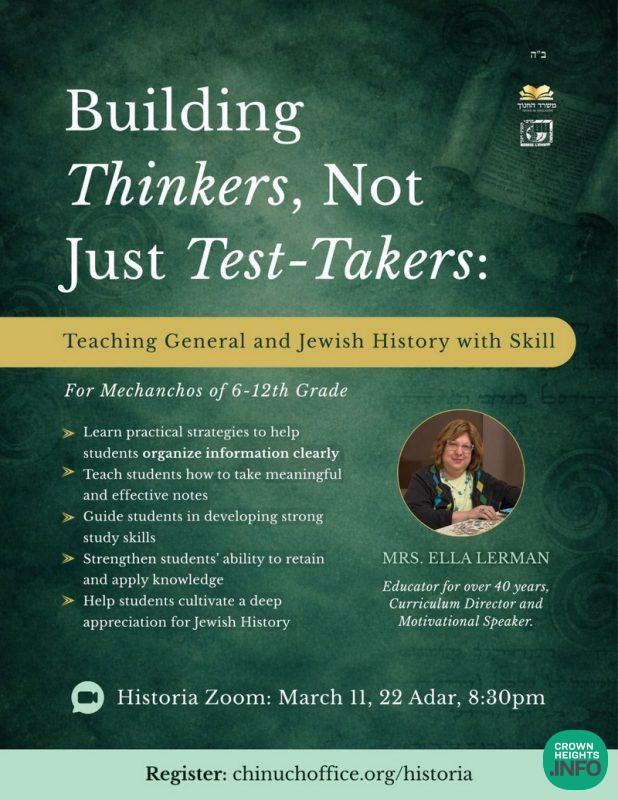 The Merkos Chinuch Office invites Historia teachers of grades 6–12 to a focused professional development session: “Building Thinkers, Not Just Test-Takers: Teaching General and Jewish History with Skill.”