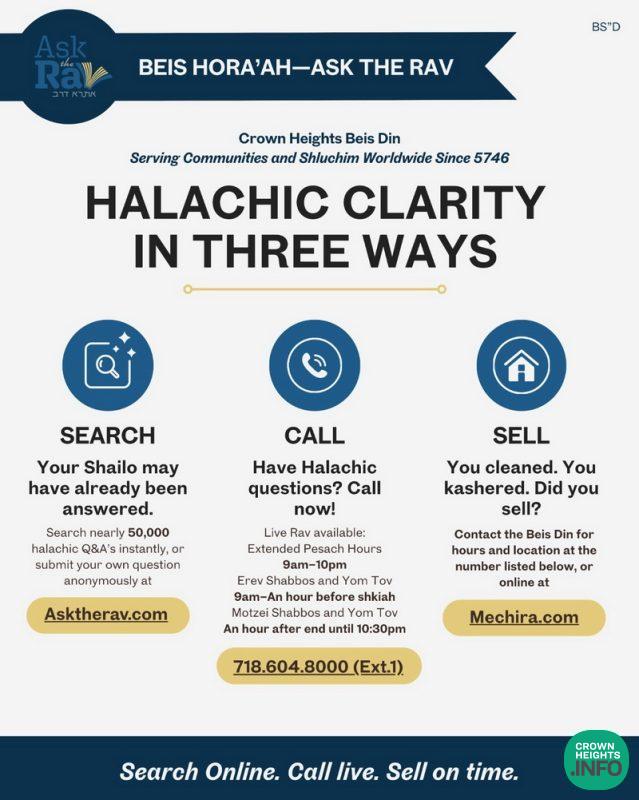 For immediate halachic guidance, contact the AskTheRav Hotline at 718-604-8000, extension 1. Operating hours until Pesach are: