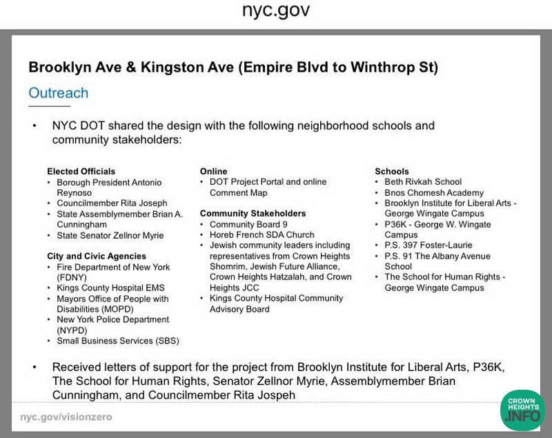 An important factor to note that on the public document released by NYC CB9 it states that the DOT shared the Kingston and Brooklyn Aves bike design with several Jewish organizations and institutions. All those Jewish organizations have opposed the bike lane.