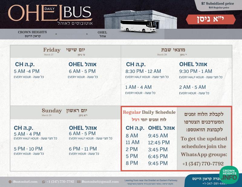 The Bus to the Ohel, which has facilitated round-trip transportation between Crown Heights and the Ohel, has released its expanded schedule for Yud Aleph Nissan.