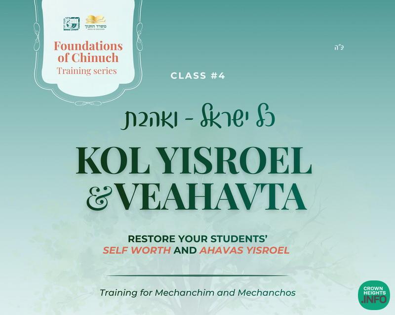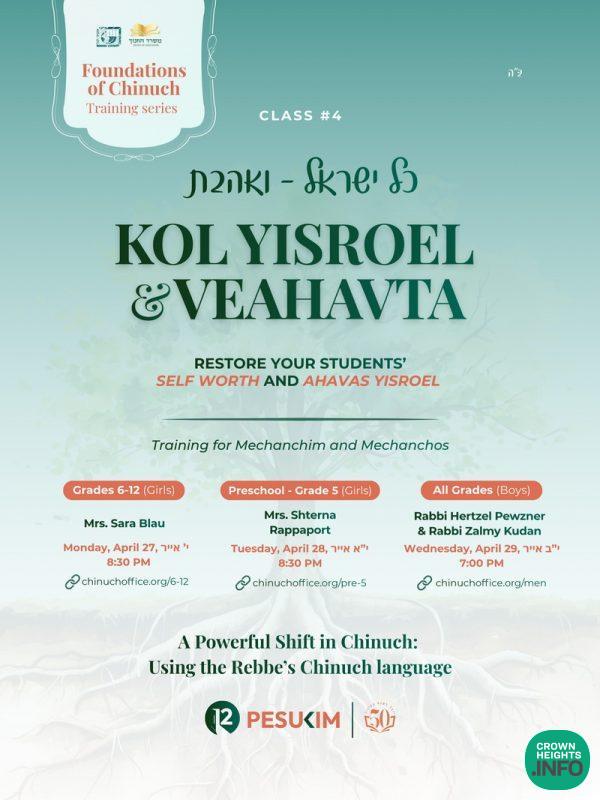 The next sessions in Foundations of Chinuch, a training series by the Chinuch Office exploring the Rebbe’s chinuch language through the lens of the 12 Pesukim, will focus on the pesukim Veahavta and Kol Yisroel. These sessions will explore Veahavta as a core yesod and Kol Yisroel as a powerful message of the preciousness and value of every Yid, and how these messages shape the way children see themselves, relate to others, and experience the classroom environment.