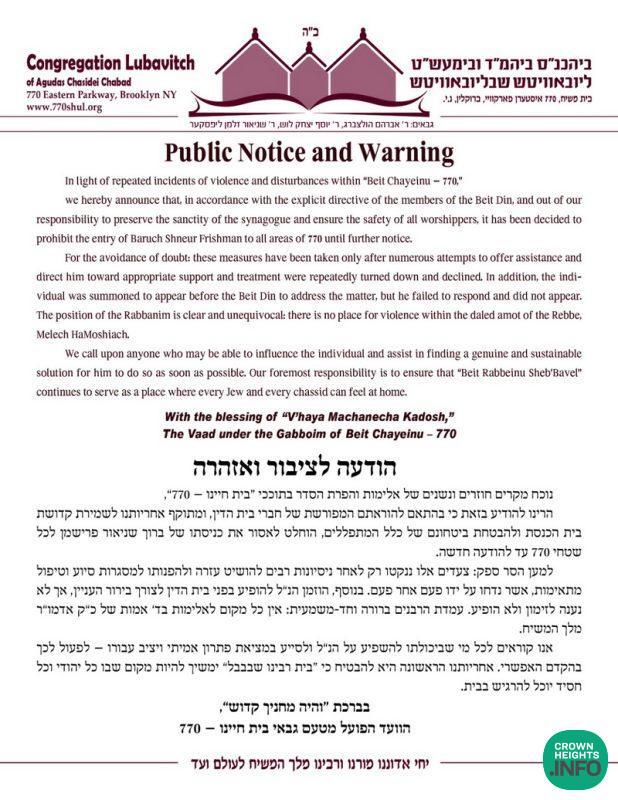 In a public notice, released by the Vaad under the Gabboim of “Beit Chayeinu – 770,” the Vaad states that the decision was made “in accordance with the explicit directive of the Beit Din” and out of a responsibility to preserve both the sanctity of the shul and the safety of its worshippers. The individual named in the notice, Baruch Shneur Frishman, is prohibited from entering all areas of 770 “until further notice.”