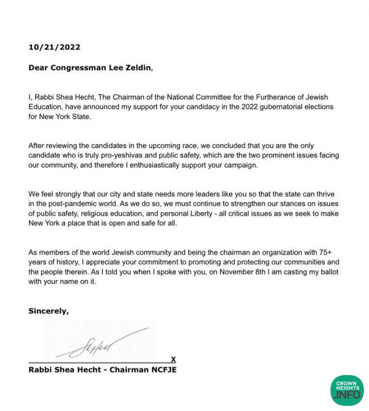Rabbi Shea Hecht Endorses Zeldin, Backs CHRC Endorsement