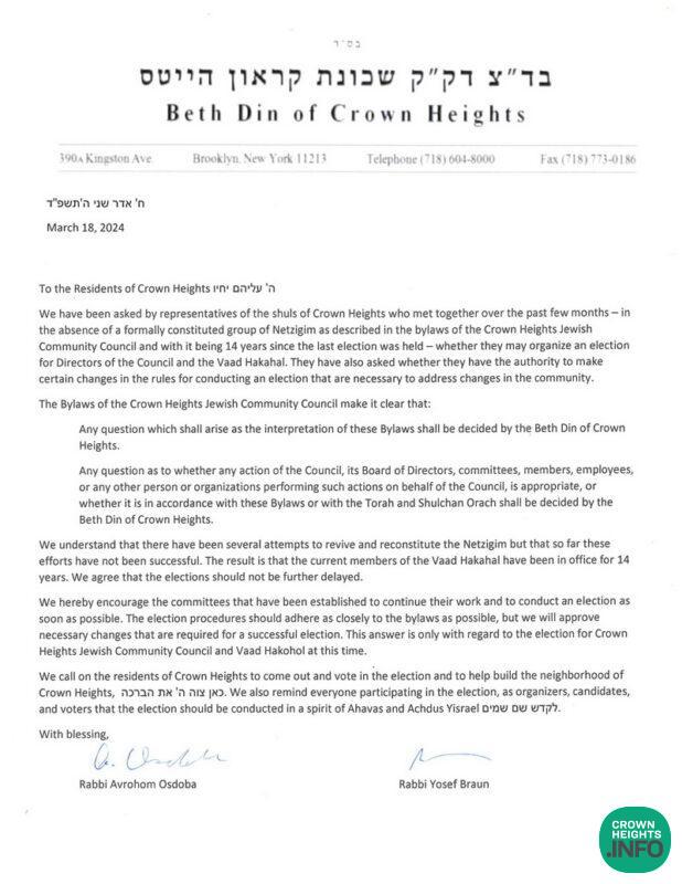 In another step towards an election 14 years in the making, the Crown Heights Bais Din has released a letter supporting an attempt to set up elections for this year.
